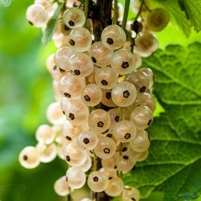 Description : Variété ayant la particularité de produire des grappes à baies blanches, légèrement dorées. Ces fruits ont une saveur très agréable, plus douce (moins acide) que les variétés à baies rouges.